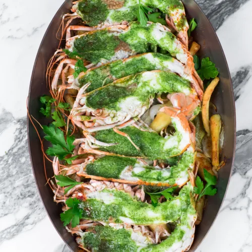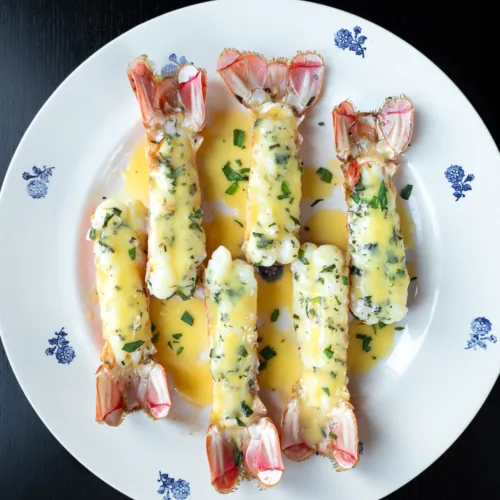 Tilberede sjøkrepshaler i skallet, bakt med ingefær og gressløk under grill. Steke i panne på skallsiden og nappere med beurre blanc tilsatt estragon.