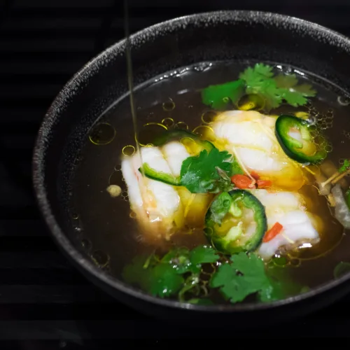 Halene renset for skall og lagt noen sekunder i en kokende aromatisk og eksotisk buljong. En intens smak og uforglemmelig matopplevelse slik det ble servert hos restauranten Le Duc i Paris. Brødrene Jean og Paul Minchelli skapte i sin tid det intime stedet og den geniale sjømaten som snudde opp ned på den etablerte klassiske franske kokekunsten. Restauranten ligger der i 243, boulevard Raspail og det er sønnen Dominique som står i døra og ønsker velkommen.