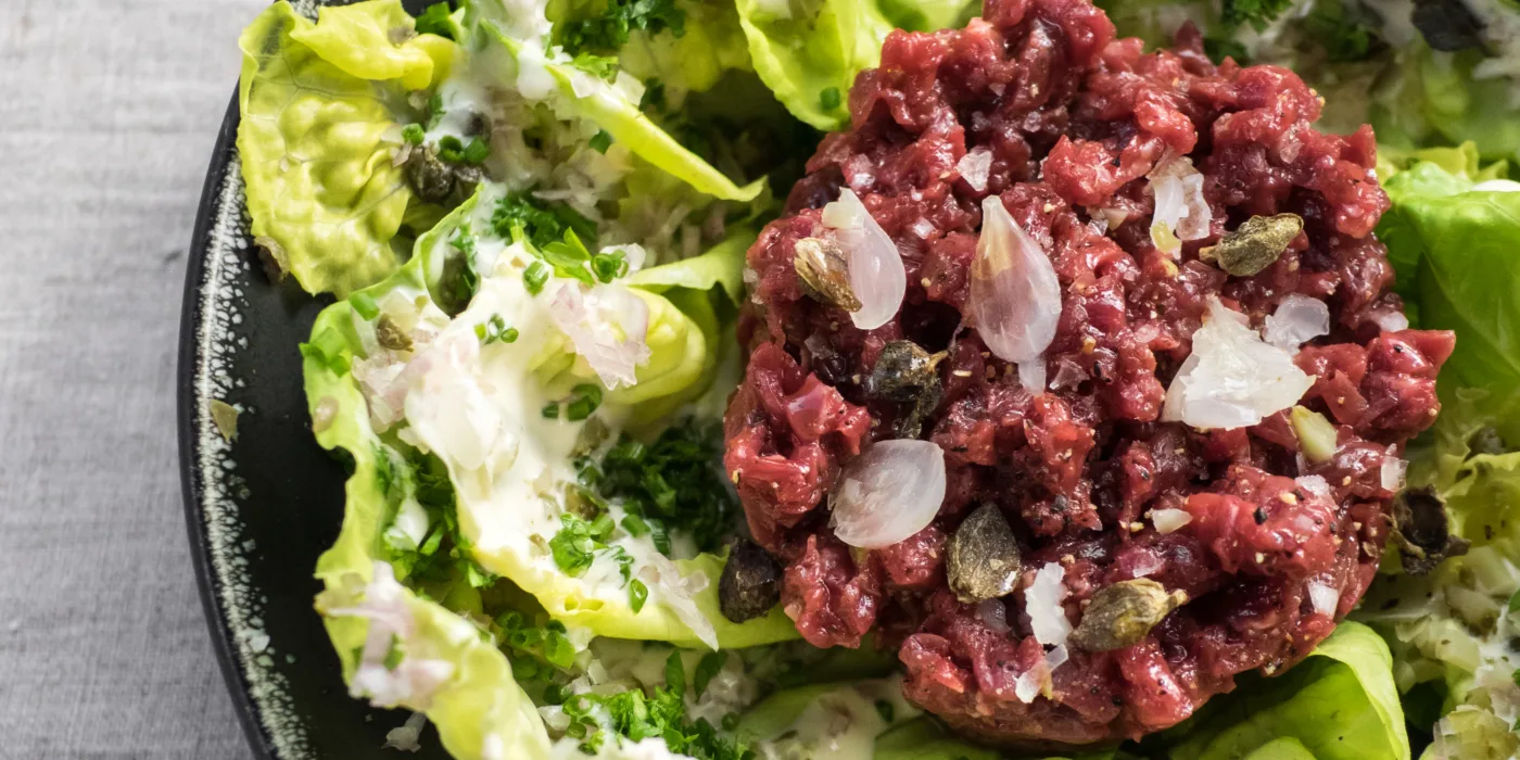 Parisere spiser Biff tartar med salat og pommes frites. Kvaliteten på denne retten står og faller med kvaliteten og temperaturen på kjøttet. Det skal være kaldt og hakket i øyeblikket.