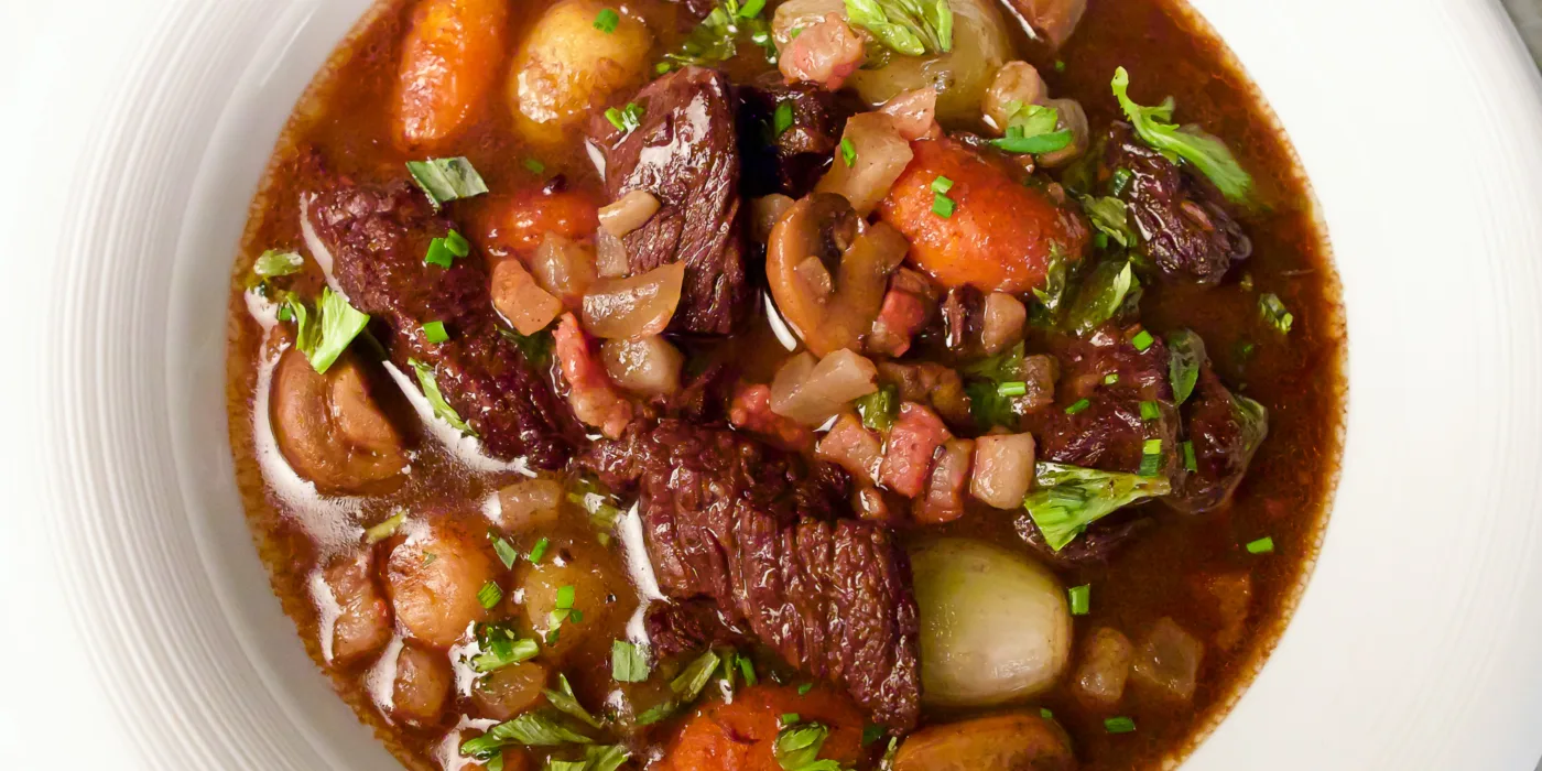 Retten stammer fra Burgund (Bourgogne) i Frankrike, et område kjent for sitt storfe og sine rødviner. I middelalderen var kjøtt ofte seigt og krevde lang tilberedning. Løsningen var å langtidskoke kjøttet i vin, noe som både mørnet kjøttet og ga smak.