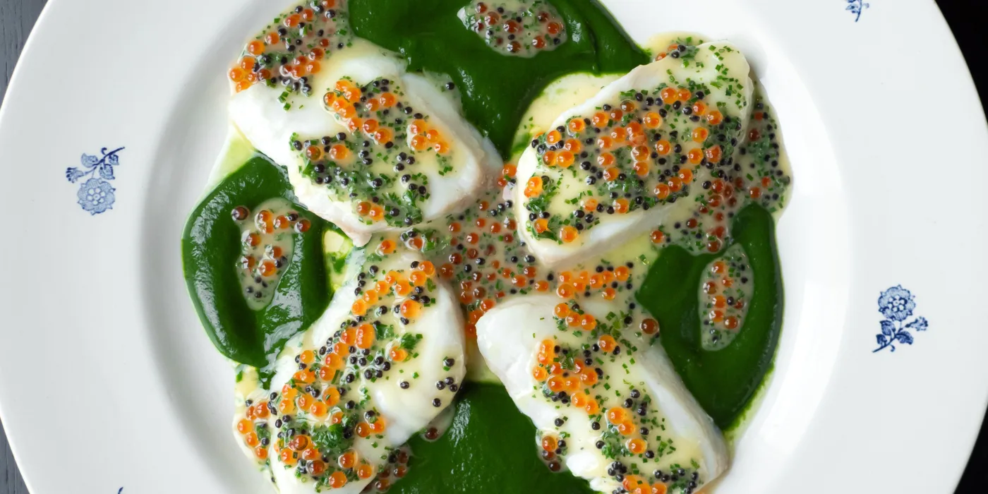 Kveite med spinatkrem og kaviarsaus