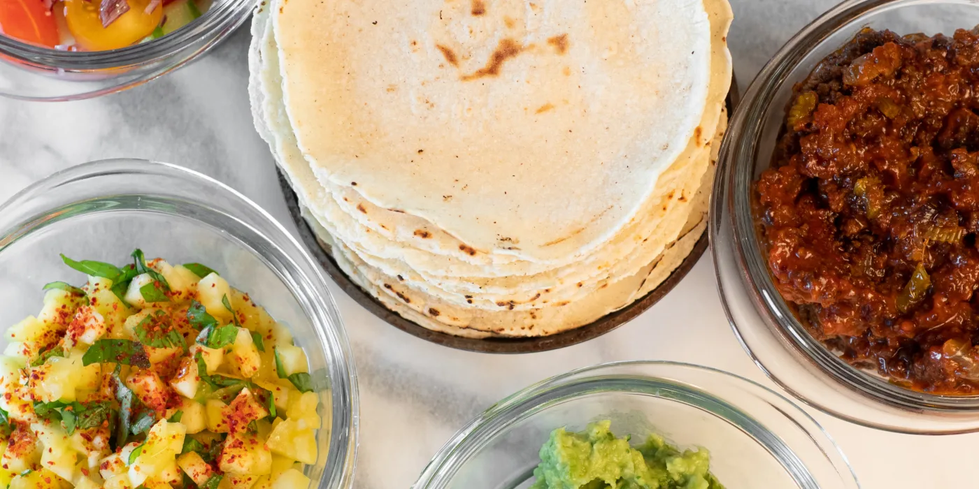 Server taco-ragù i tacolefser med guacamole, mangosalsa og tomatsalsa.